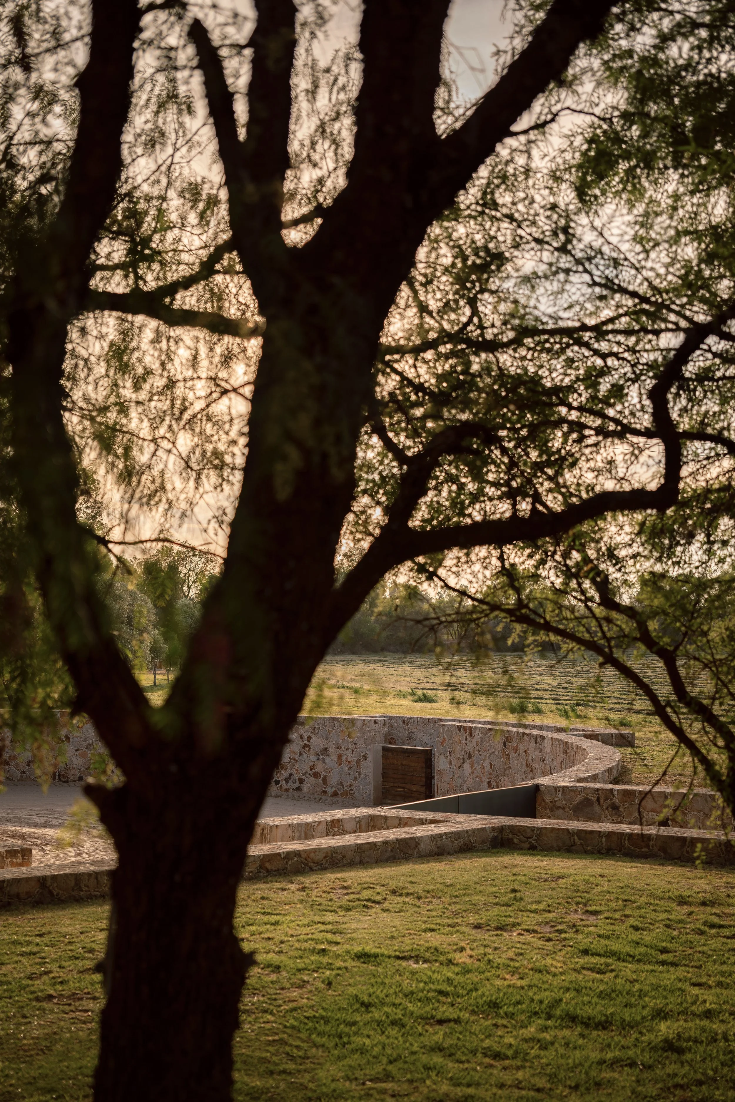 El acceso a la plaza se da a través de una escalera que desciende siguiendo la curvatura del ruedo. Este recorrido atraviesa un túnel diseñado para proteger dos antiguos mezquites, y desemboca en un patio semi-enterrado a su sombra, con una pequeña fuente que brinda frescura y pausa. Desde ahí se accede al palco de ganaderos, desde donde se dirige la tienta. Este espacio cuenta con una ventana amplia que enmarca al frente el muro del ruedo y, al fondo, la silueta monumental de la Peña de Bernal. A un costado se ubica una cava discreta, y al otro, el acceso al burladero principal y al ruedo.