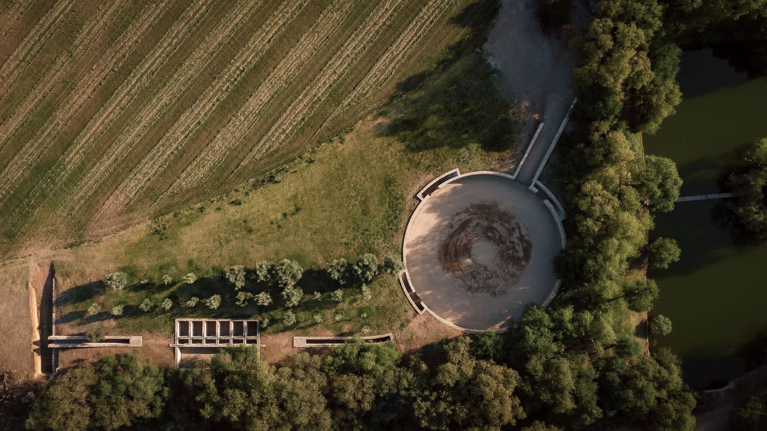 Con esta intención, se eligió como emplazamiento el ángulo formado por un talud natural existente, el cual se aprovechó para alojar parte de la plaza. La integración del resto del ruedo al terreno se resolvió mediante una pendiente suave que prolonga la topografía de la pradera, logrando que el conjunto se funda visualmente con el entorno.