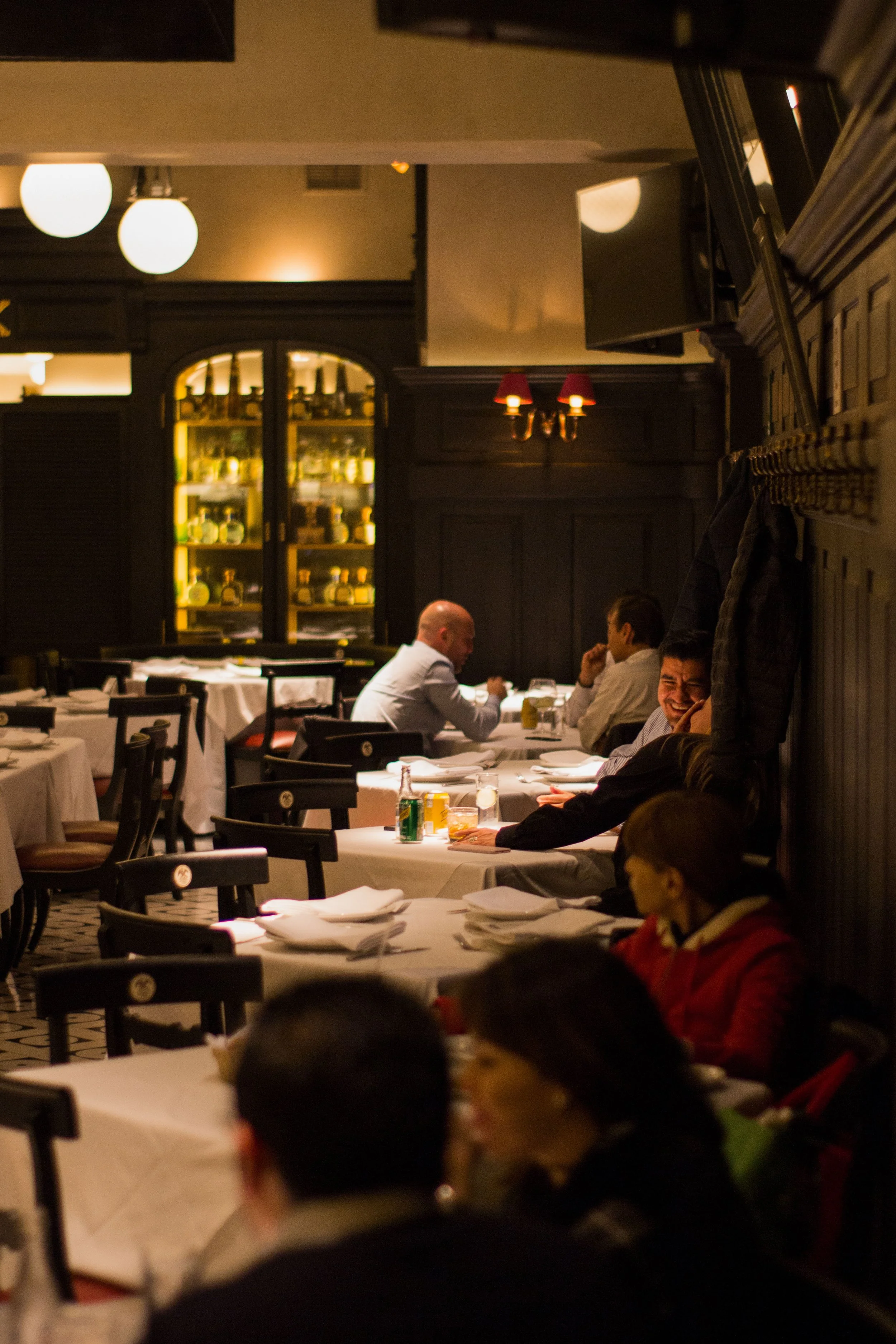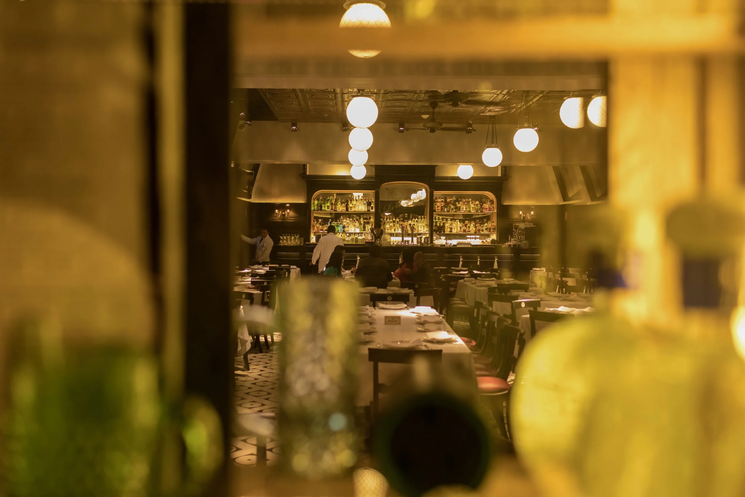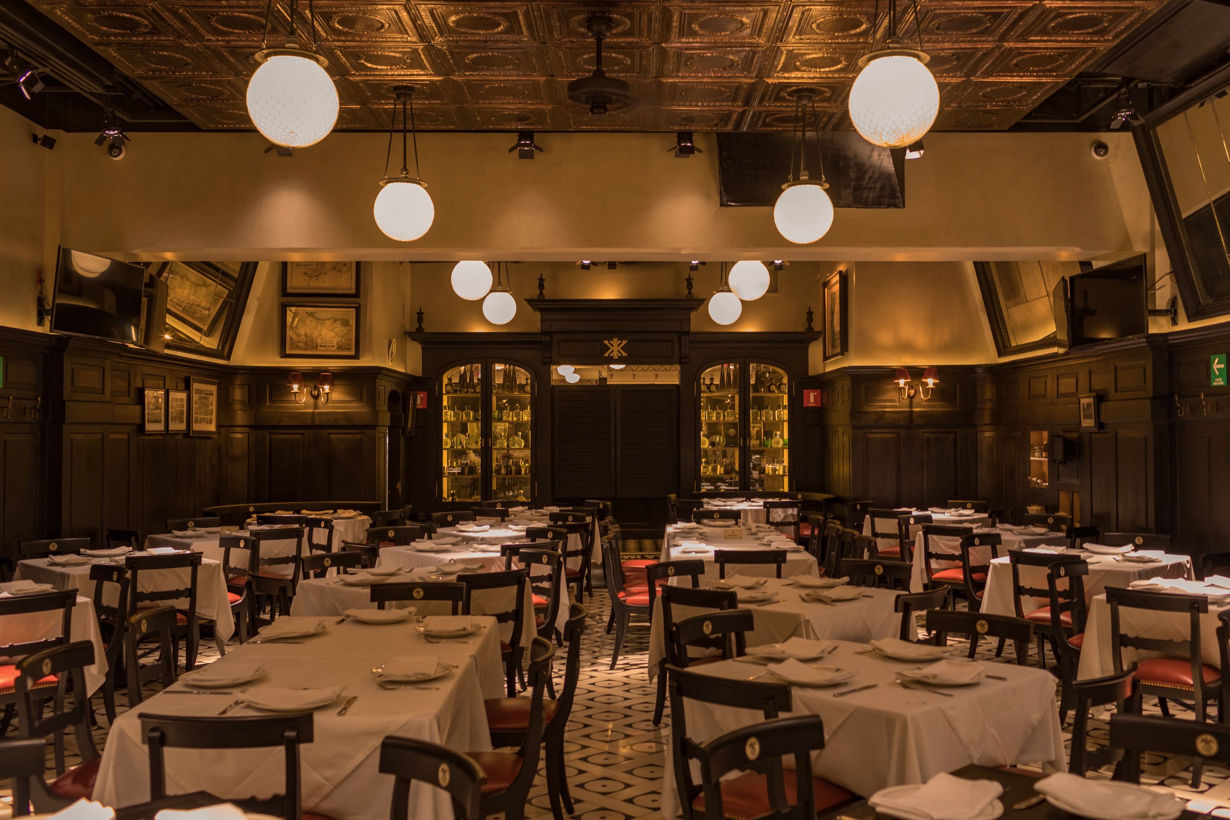 Una vez en el sótano, un segundo vestíbulo da paso al salón principal. El ingreso se realiza por puertas típicas de cantina, flanqueadas por vitrinas de doble cara que permiten una lectura visual entre espacios. Al fondo, una espléndida barra con contrabarra remata el eje visual del salón. Tanto la barra como las vitrinas y sillas fueron y fabricadas especialmente por Galerías Chippendale.