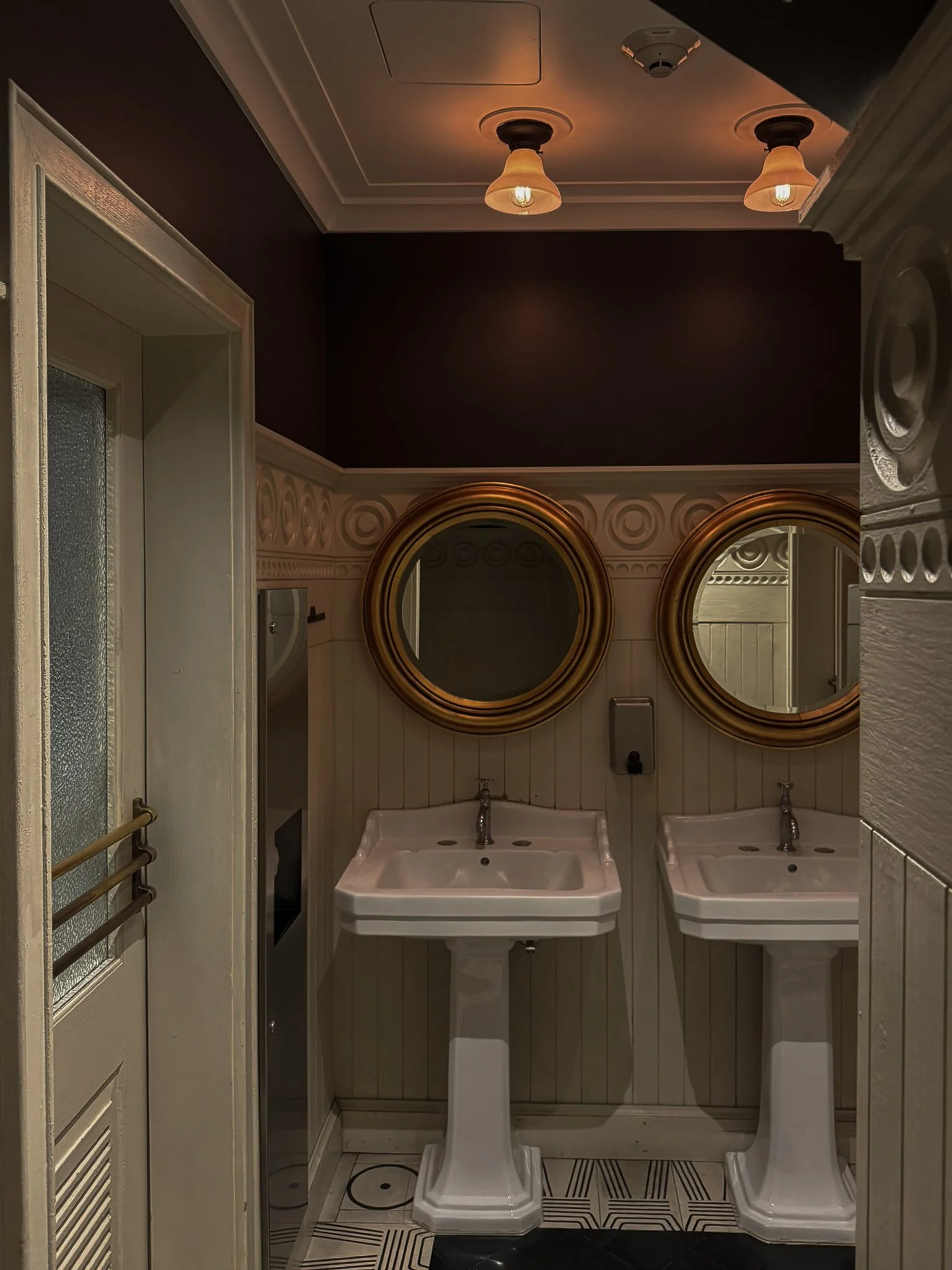 En los baños, el lambrín que acompaña los lavamanos de pedestal está inspirado en el rodapié del adoratorio a Tláloc del Templo Mayor. Se remata con zoclos y cornisas de corte europeo, en el espíritu del Porfiriato. Los espejos circulares también aluden simbólicamente a Tláloc.