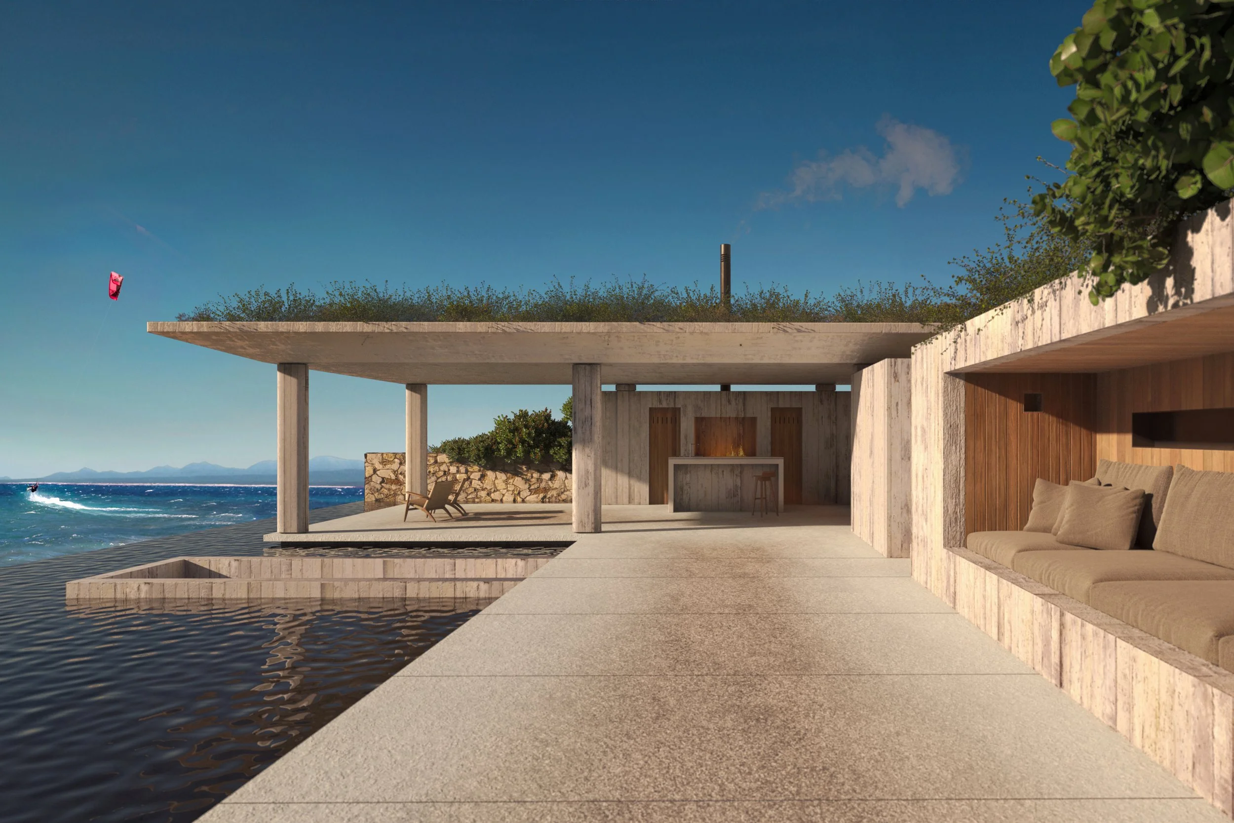 En el acceso, del lado de la carretera, se ubican dos locales comerciales que, junto con los estacionamientos, bodegas y área de servicios y administración, forman un primer patio de acceso. A medida que el terreno desciende, se van intercalando las cinco viviendas, culminando en un club de kitesurf ubicado un nivel por debajo de la última casa, para no obstruir las vistas del conjunto. A través de un espejo de agua que funciona también como alberca, se accede al kite shack, un espacio de almacenamiento de equipo de kitesurf, resuelto con repisas de madera, ventilación cruzada y luz natural indirecta.