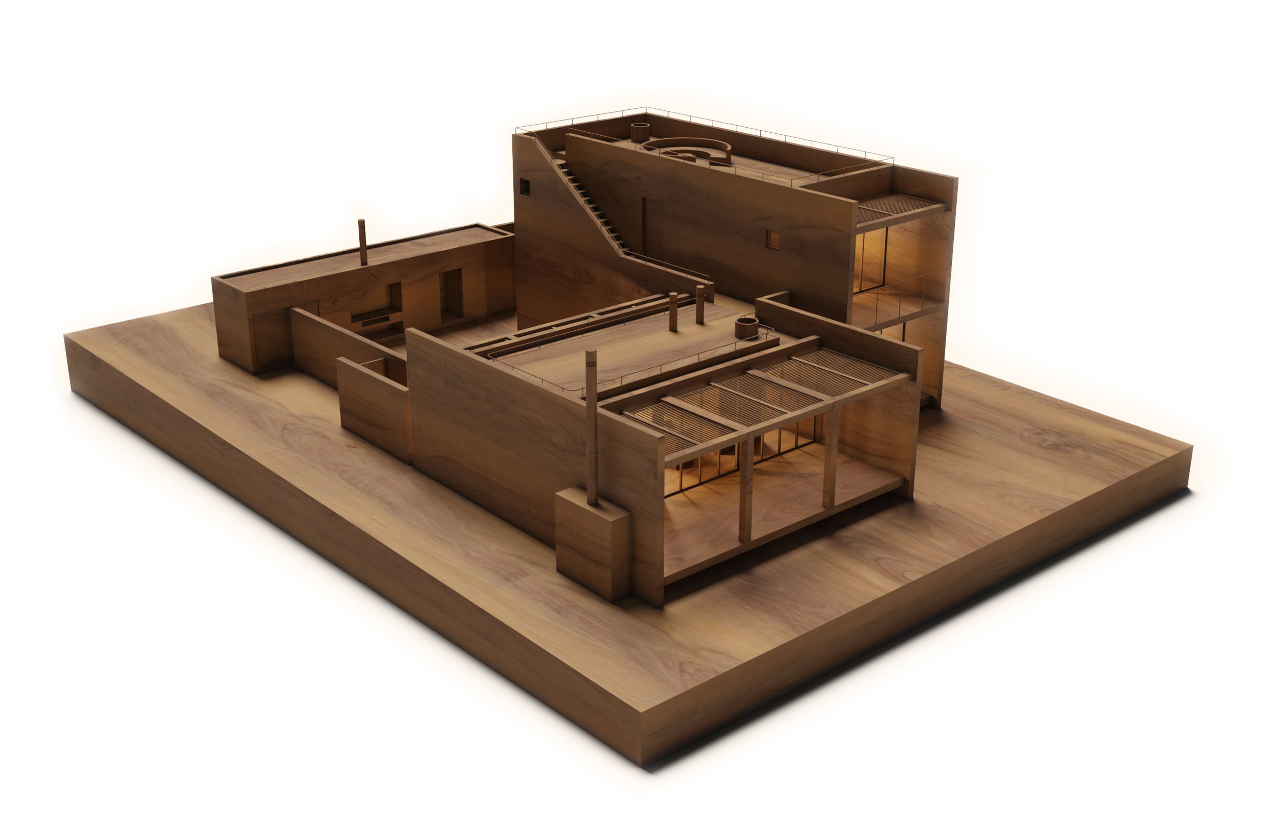Cada vivienda se compone de tres volúmenes dispuestos alrededor de un patio central, que organiza el programa arquitectónico y actúa como resguardo contra el viento. El volumen frontal, de menor altura, contiene las áreas sociales: cocina, sala, terrazas y chimenea. El volumen vertical alberga tres recámaras, todas con terraza, y se remata en la parte superior con una azotea-mirador. El volumen posterior, orientado hacia el patio, funciona como barra de servicios e incluye un asador, lavandería, owner’s lockers y cuarto de basura. Finalmente, una barda baja con acceso tipo esclusa delimita el patio sin comprometer la apertura visual del conjunto.
