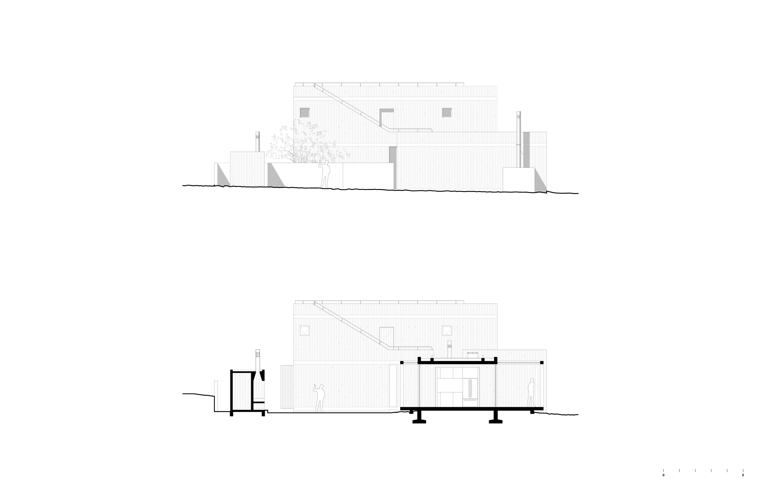 El enduelado vertical en concreto aparente alude de forma abstracta a la arquitectura pesquera tradicional, inspirada en los tablones de madera de estaciones balleneras y estructuras de apoyo a la pesca.